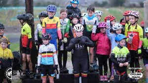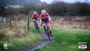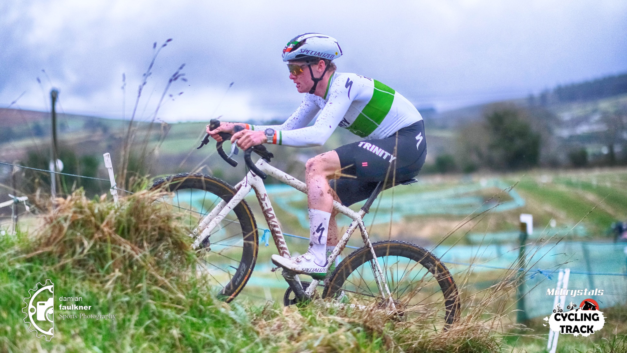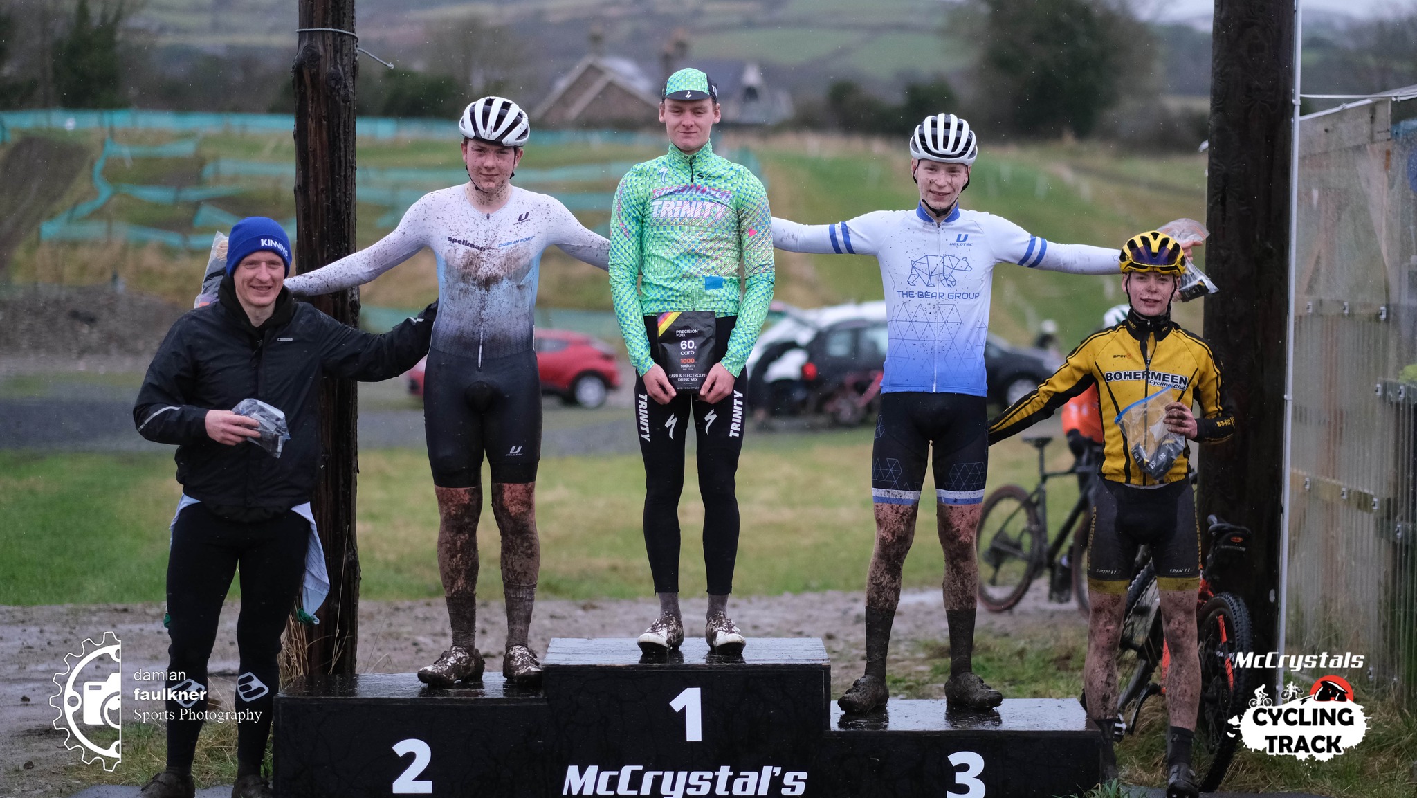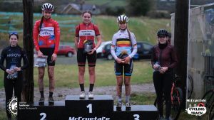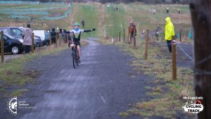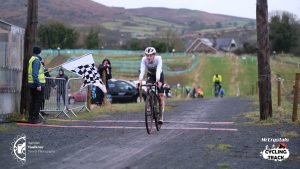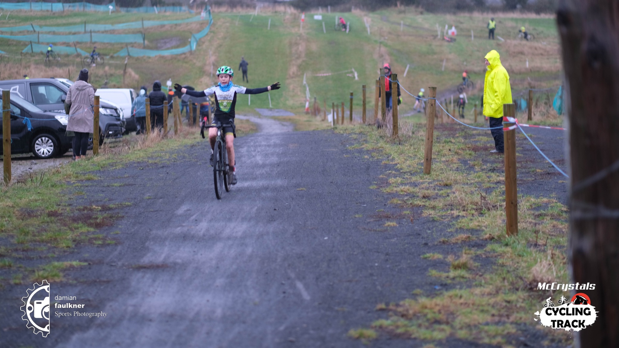 We had 50 riders on the line for the u14-masters men.. Fingers were crossed by me that everyone got through the first few bends ok. We had a couple of slips but nothing major. It was great to see some new faces trying CX out. Dean Harvey set a pace very few can live with and it was no surprise he took the chequered Dundalk FC flag first. Curtis McKee was 2nd with Rian McCrystal in 3rd. The first unplaced junior was Eoin Davis running over the line after a mechanical before the last corner. Glen Kinning had a couple of problems too but that didn’t stop him from taking the 1st unplaced masters.
