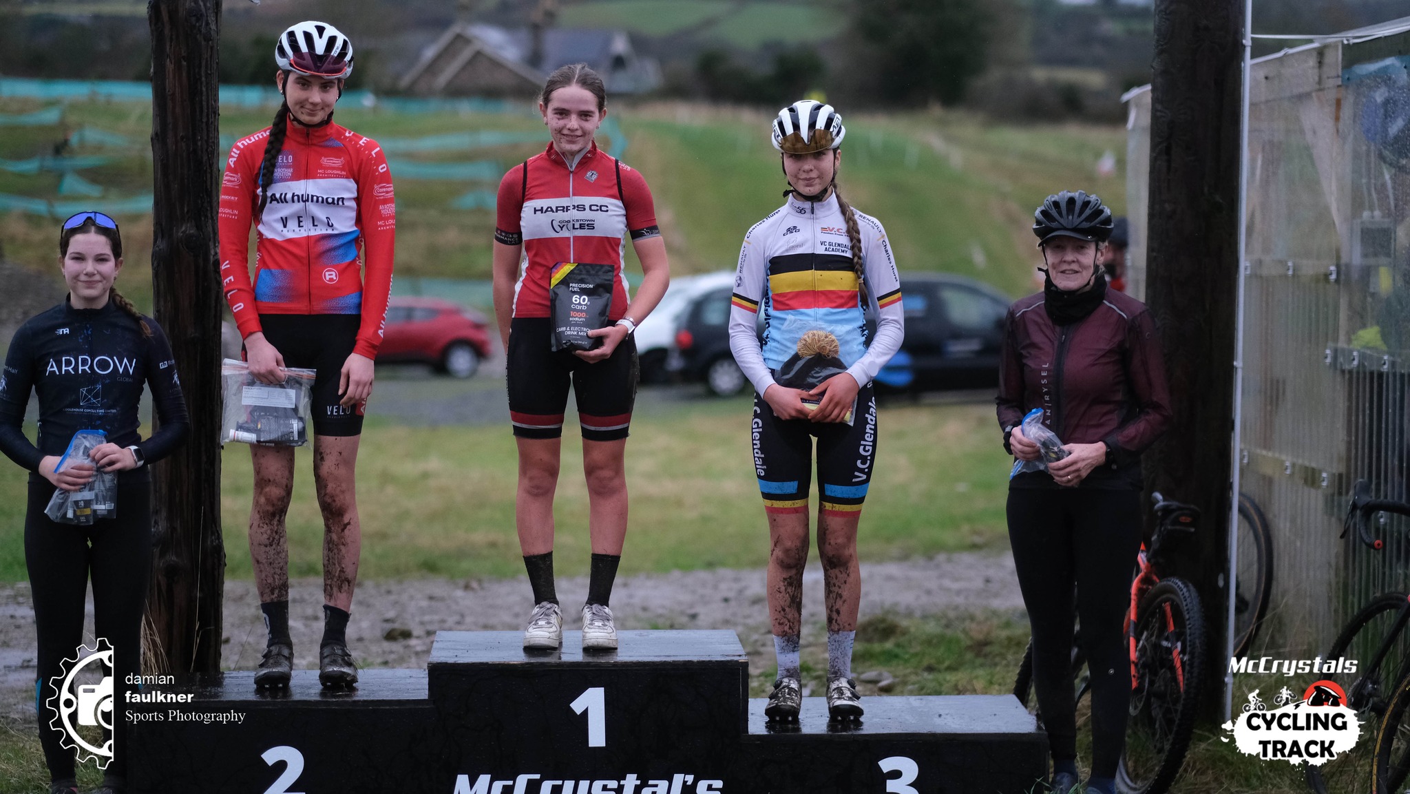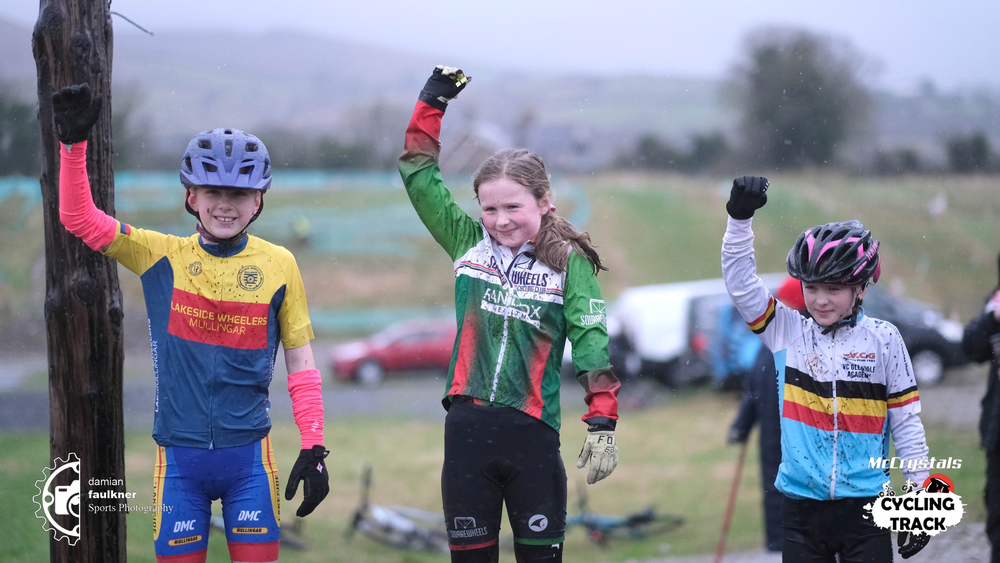The Girls U14- Master women were up next. Elana Wallace was very strong today winning from Emer Heverin in 2nd and Aoife Craig in 3rd. 3 very good riders that will go well in the Nationals. The First Unplaced Junior was Holly McCaffrey and the First unplaced Master was Helen White. The Girls certainly got the worst of the morning with the weather calming down for the next race.